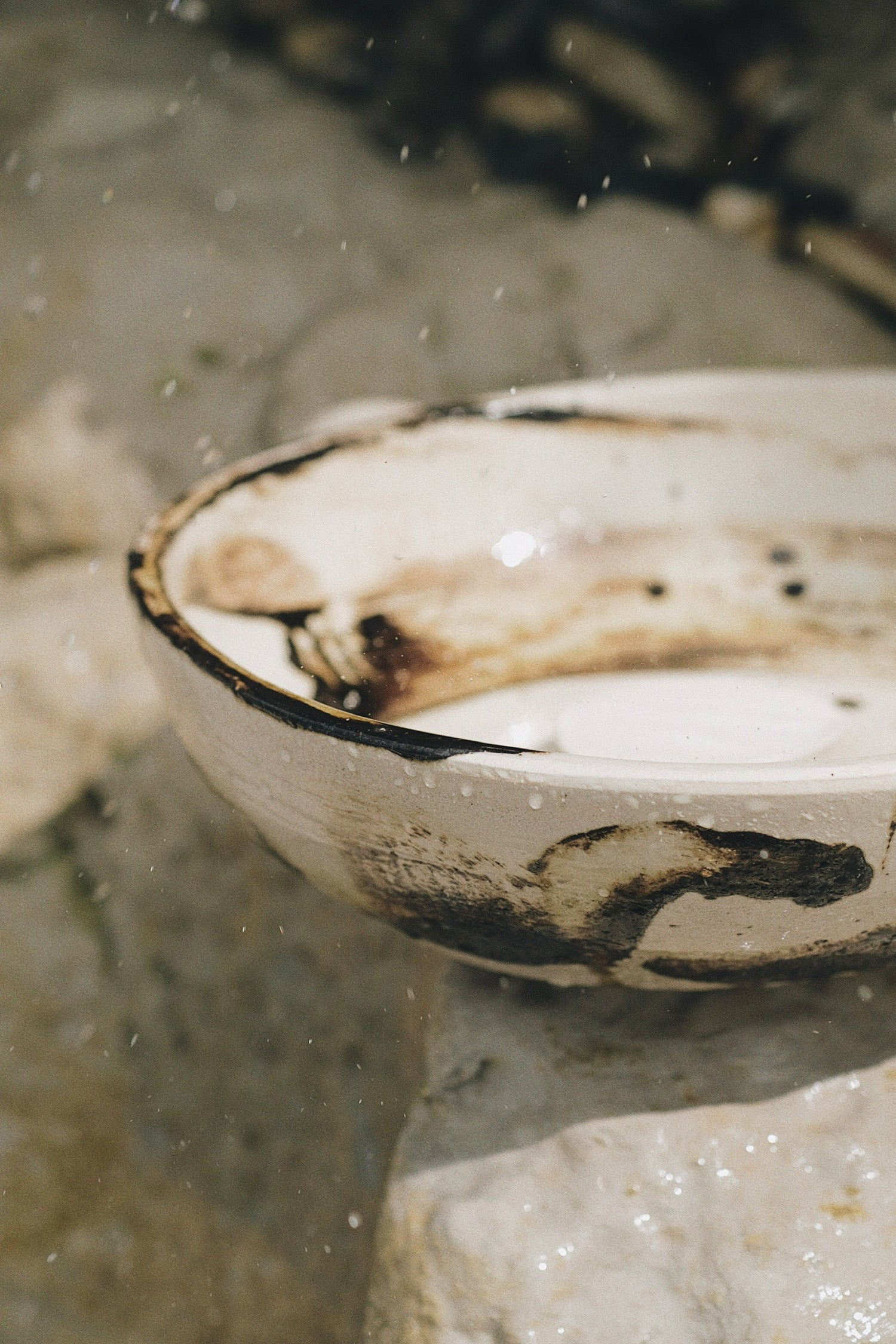 The basin is painted with black slib through a slow process. This approach is intended to allow interaction between the ceramic object and the participant and allow the different aspects of each piece's personality emerge over time and with use.